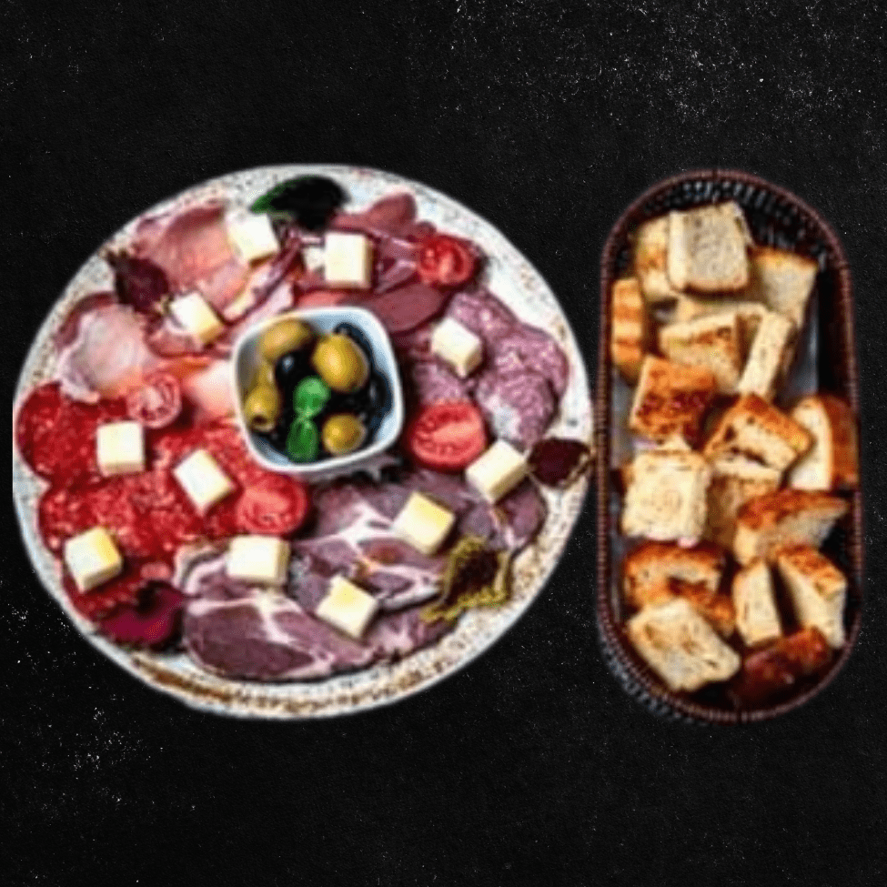 Kulen, pečenica, budimska kobasica, njeguška pršuta, suvi vrat, sir, masline.