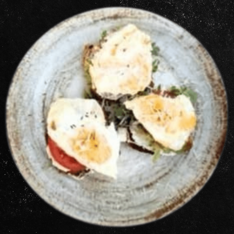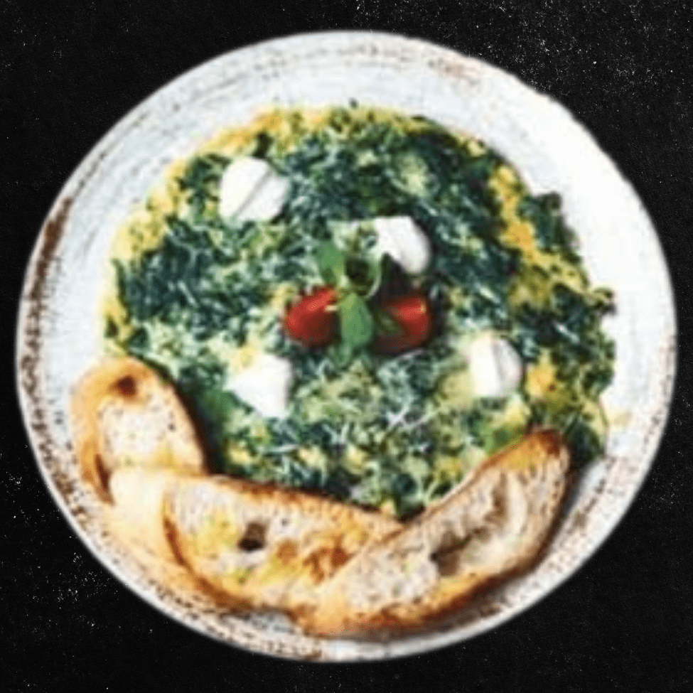 Jaja, spanać, neutralna pavlaka, sir, pesto sos.