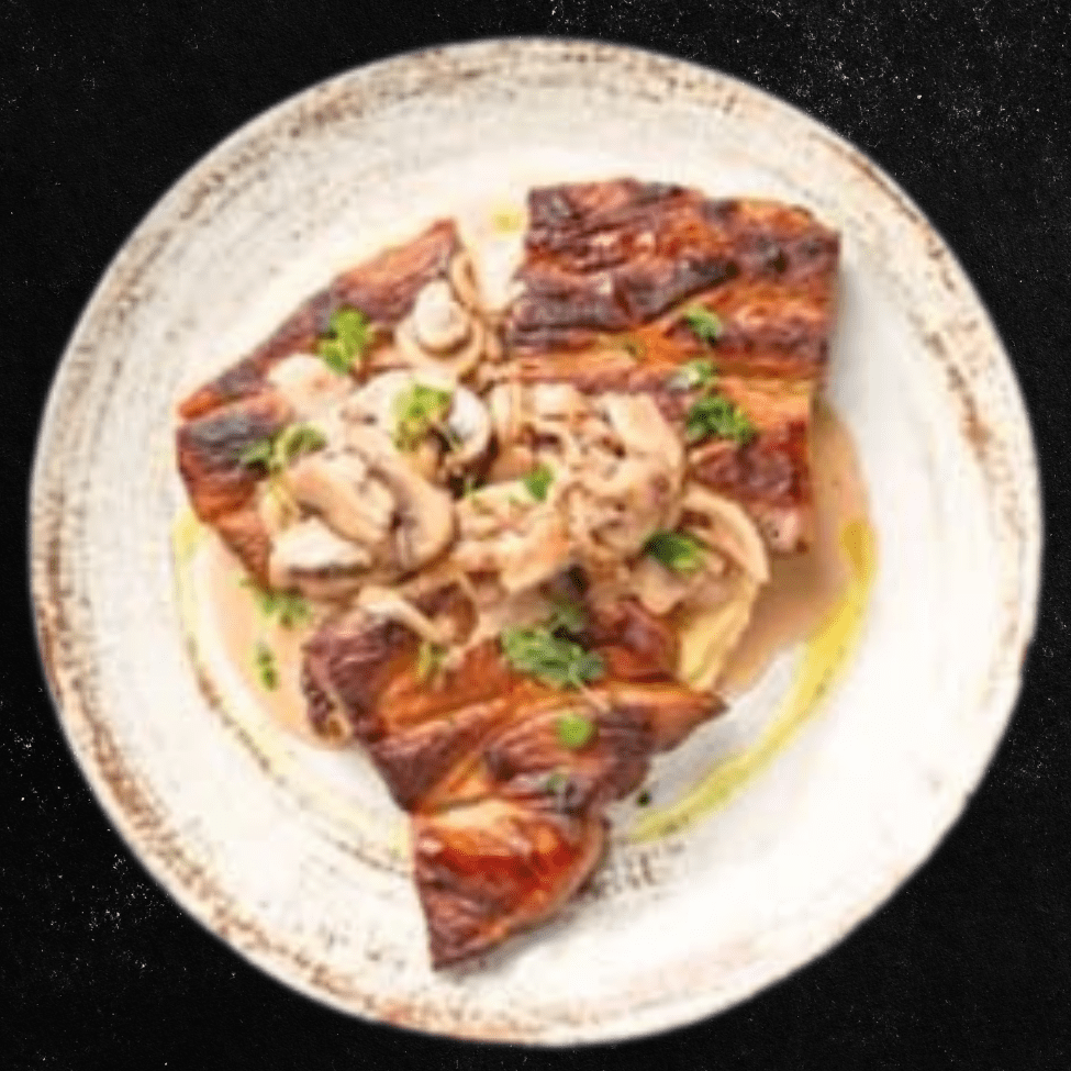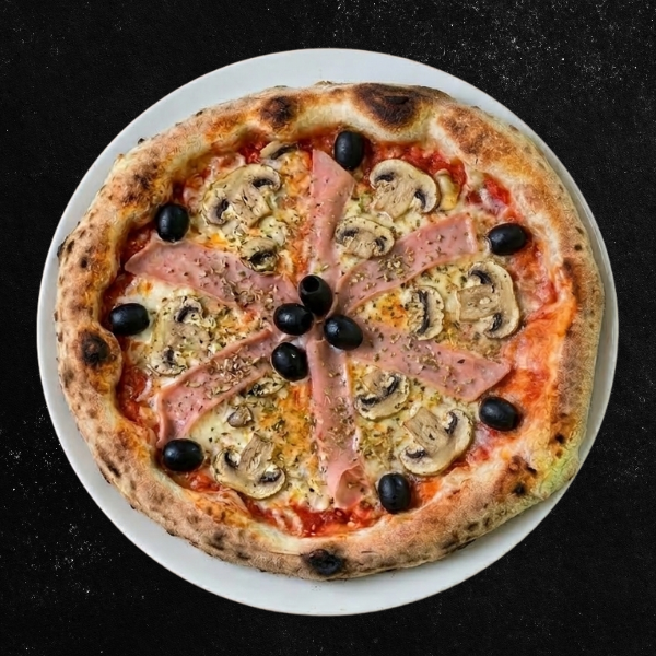 Pelat, mocarela, šunka, pečurke, masline.
