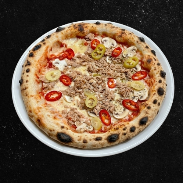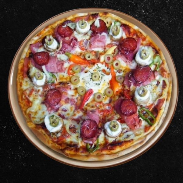 Pelat, mocarela, kulen, šunka, sveža paprika, origano, feferone.