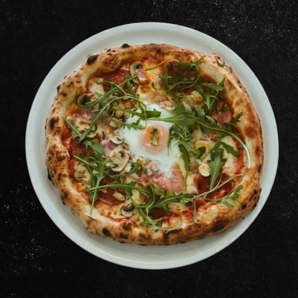 Pelat, mocarela, slanina, kulen, jaje, origano.